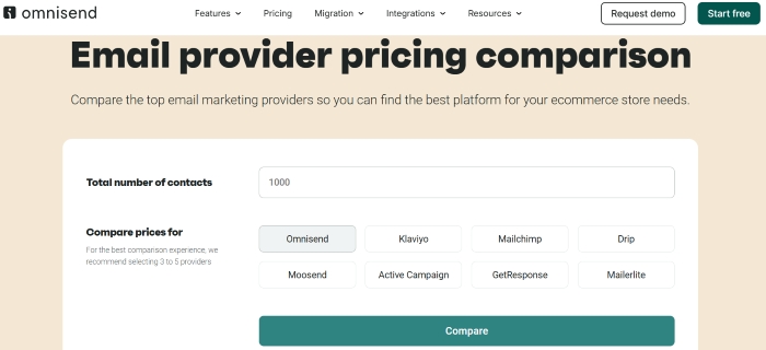Use Omnisend’s e-mail supplier pricing comparability software under to match pricing and options throughout high Drip alternate options. Enter your variety of contacts, choose between three and 5 suppliers, and see how they examine in opposition to one another.
